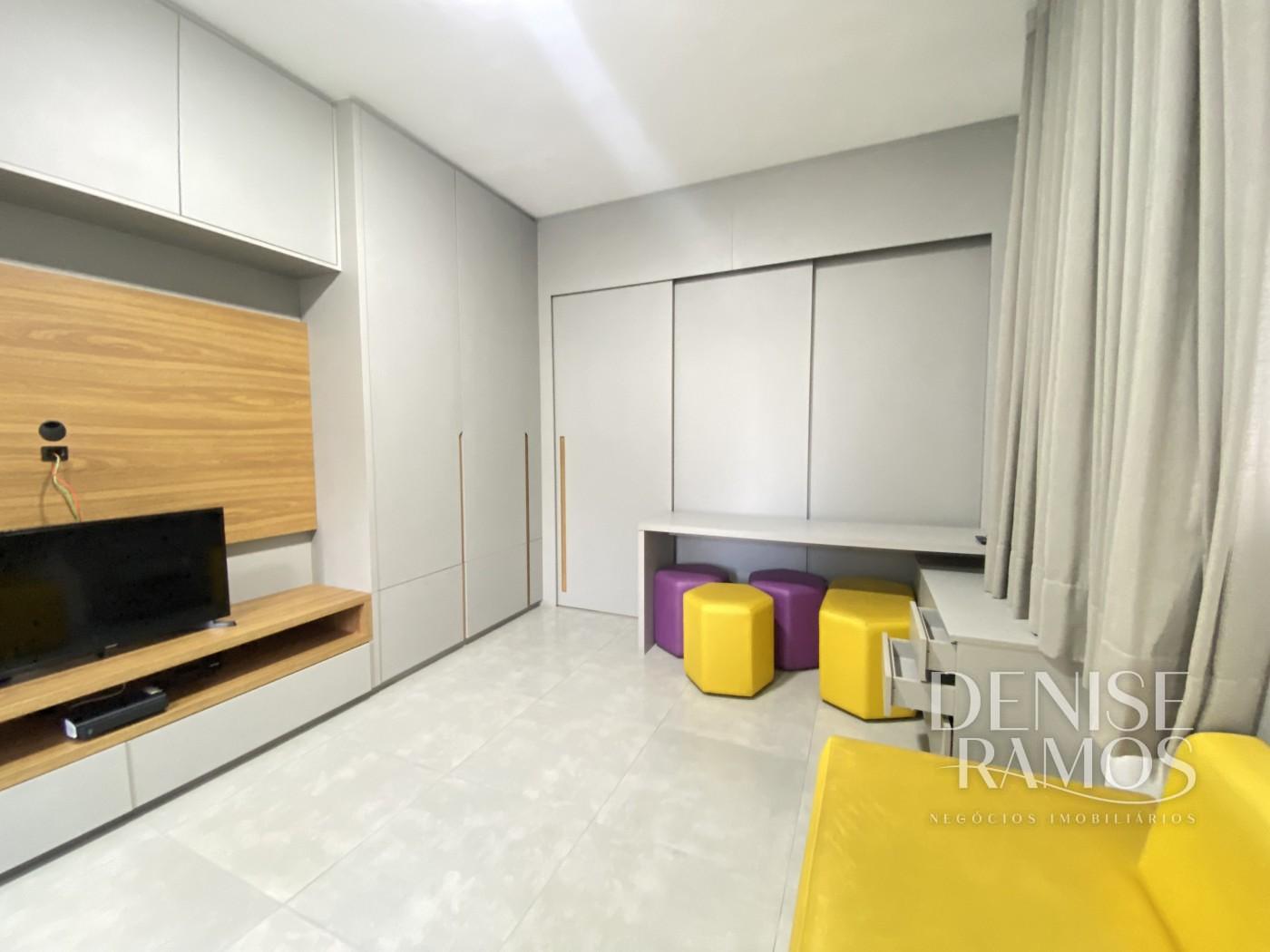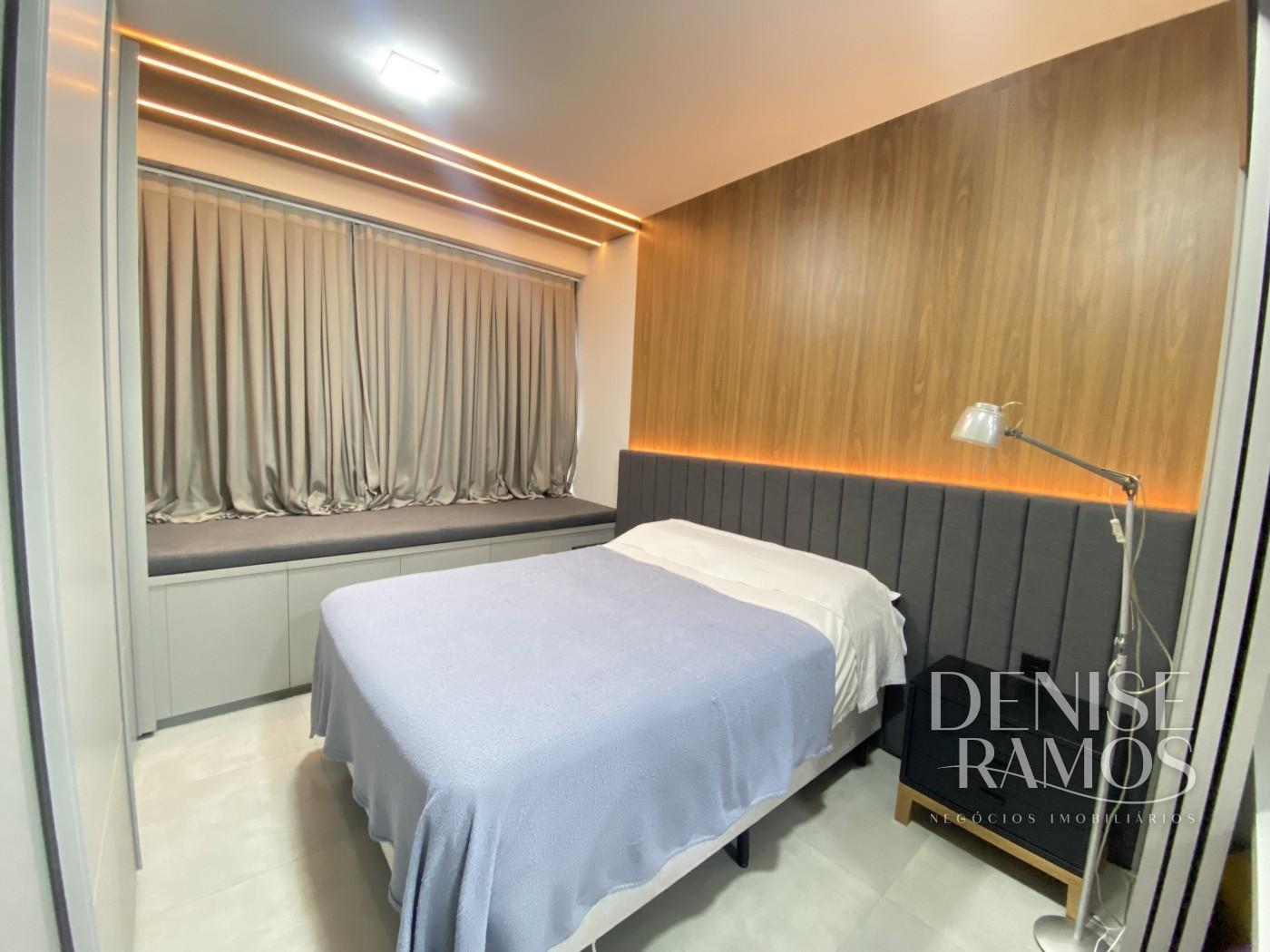 O dormitório tem roupeiro com móveis planejados, criado mudo, cama com cabeceira e cortineiro. Uma porta de correr faz divisória do dormitório com uma escrivanhia, possibilitando o trabalho em home office.