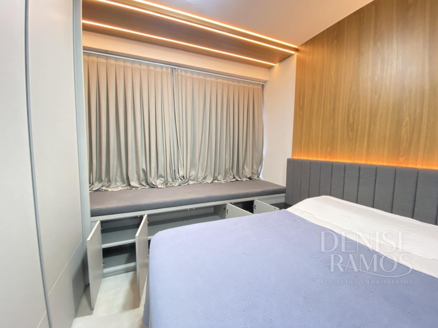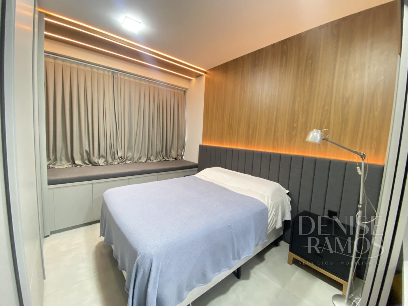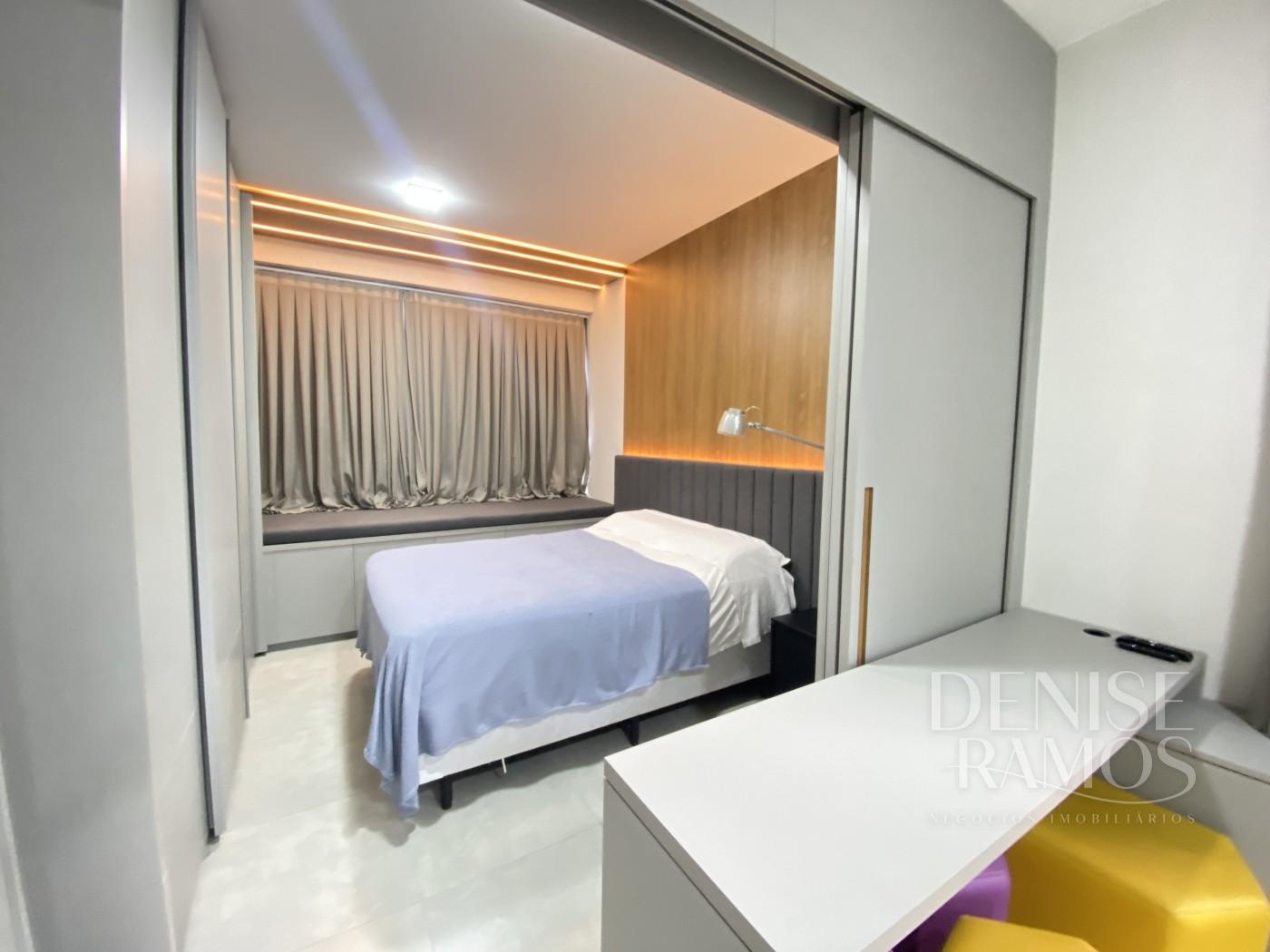 O dormitório tem roupeiro com móveis planejados, criado mudo, cama com cabeceira e cortineiro. Uma porta de correr faz divisória do dormitório com uma escrivanhia, possibilitando o trabalho em home office.